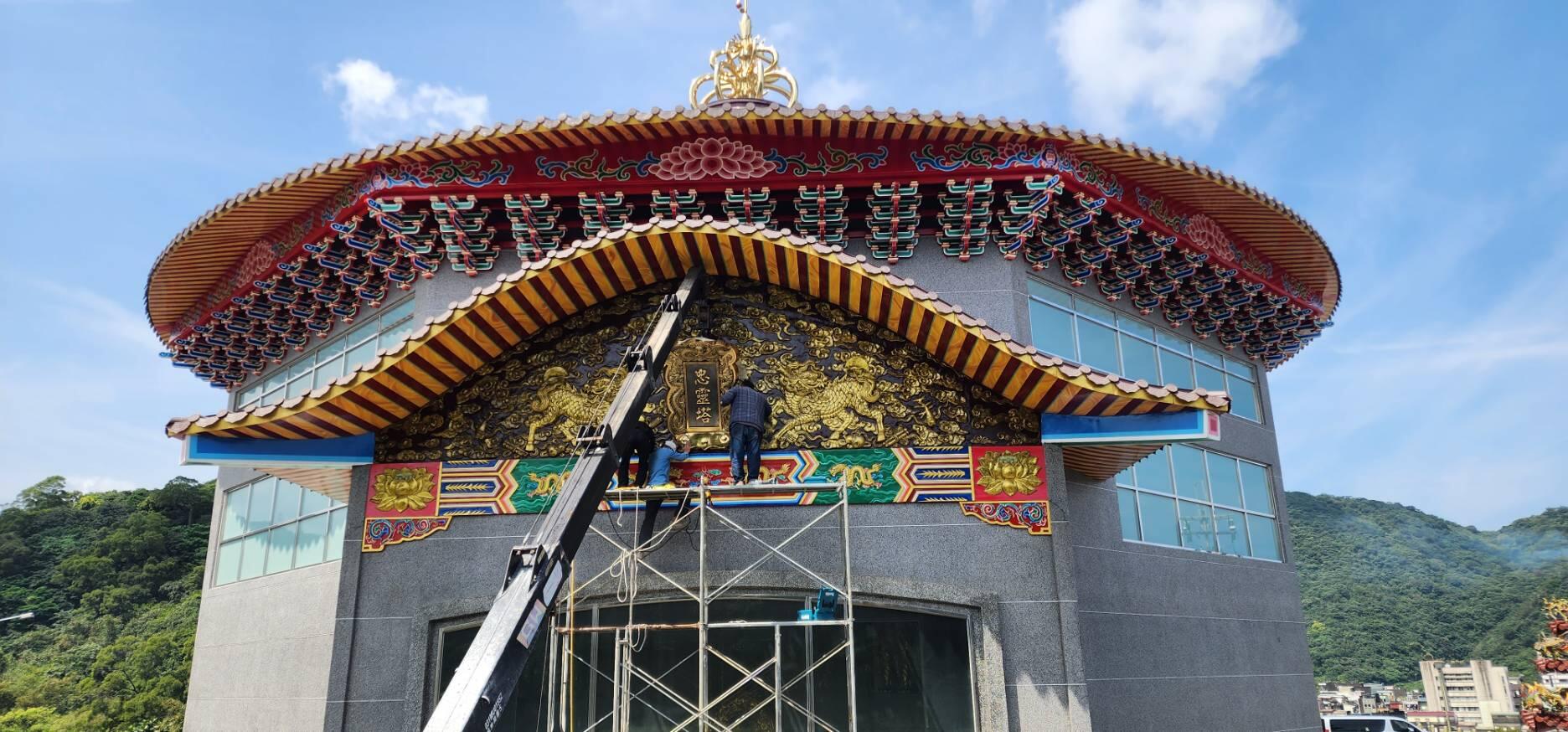 铜瓦工程、宝顶、斗拱、立体浮雕工程、牌匾