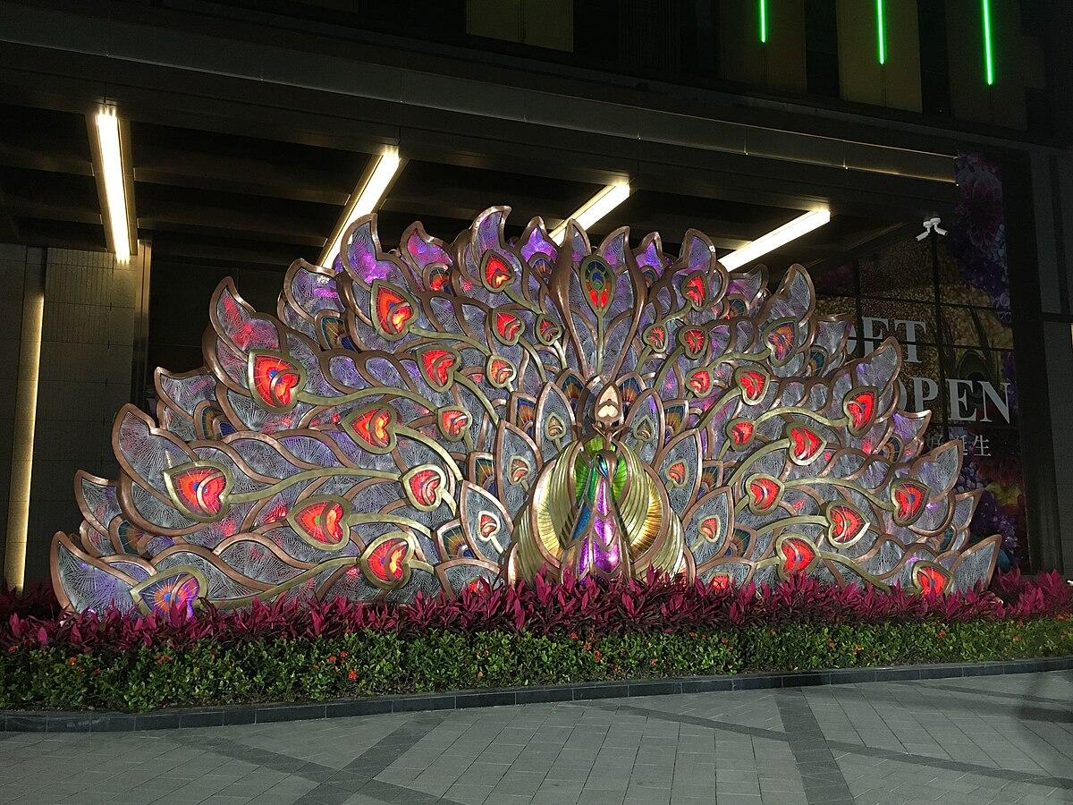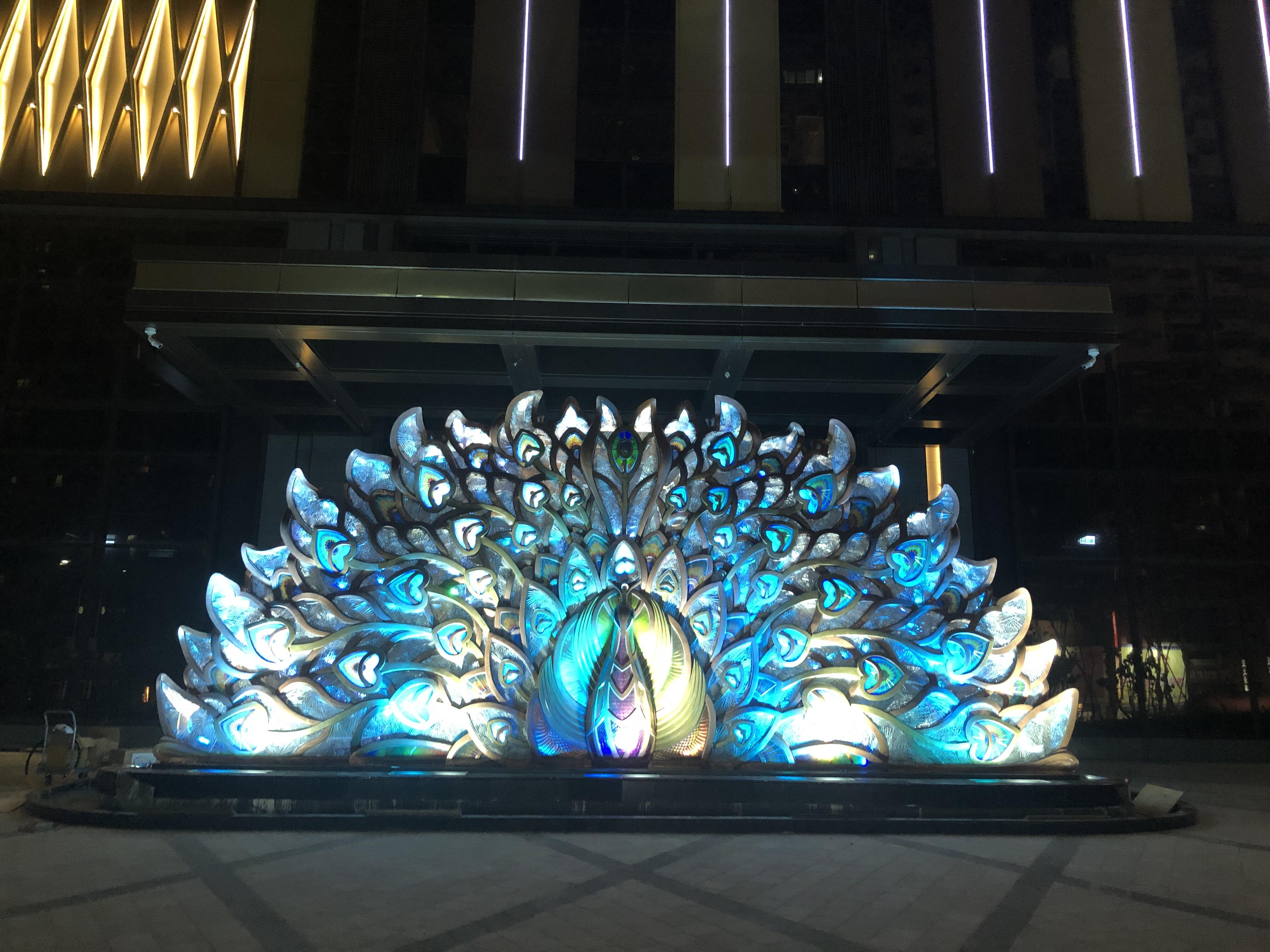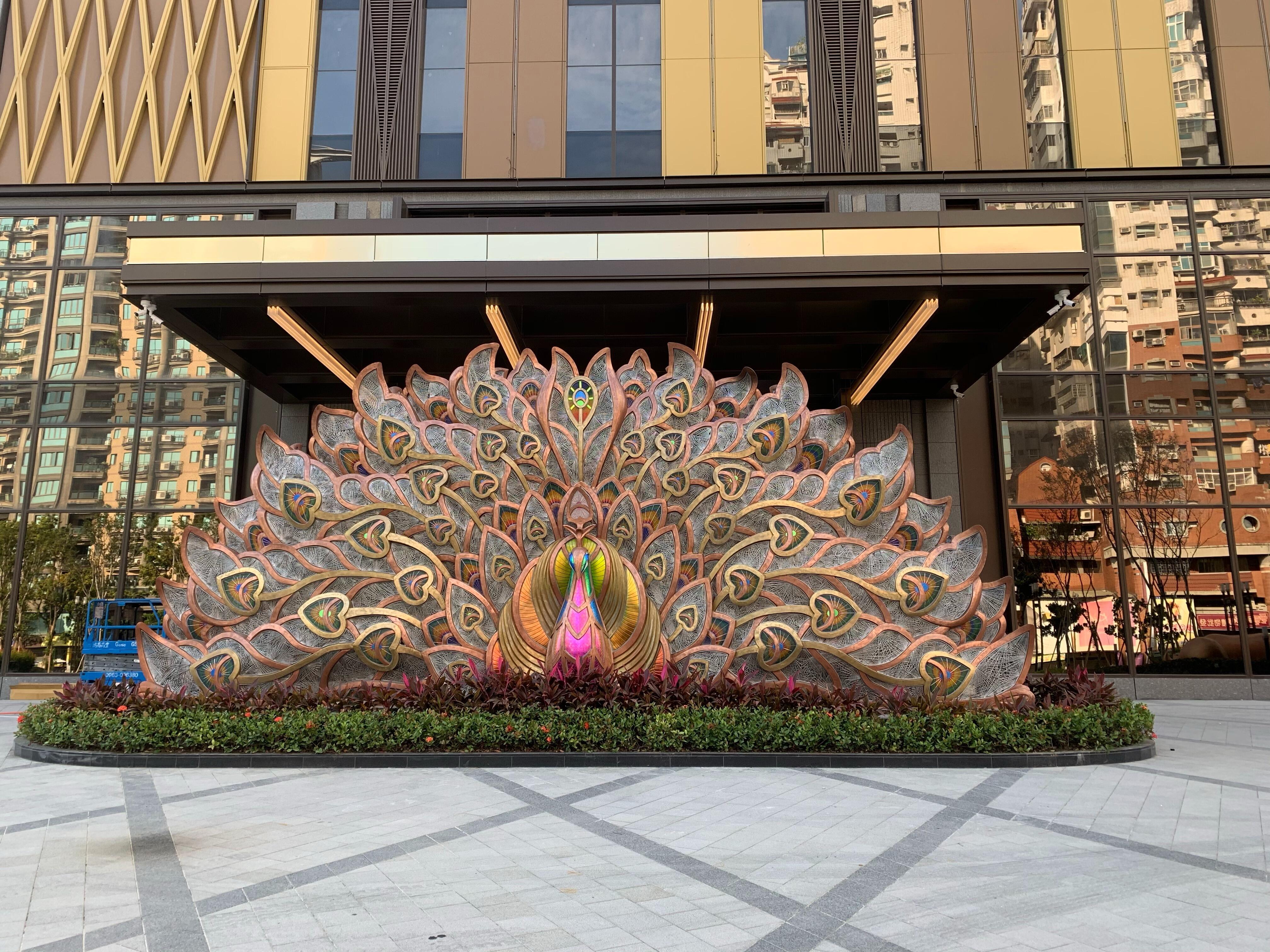 光之雀跃-孔雀开屏的装置艺术,即位在义享天地正门处,在传统文化中,孔雀是吉祥、富贵的象征,以孔雀开屏为意象融合富贵大器设计理念,迎来每一位贵宾。羽毛以黄铜、红铜不同材质依不同时间光线角度折射出幻彩效果,主身及羽毛眼以融合玻璃灯饰打造,透视出羽毛晶体般的质感,另有光雕秀设计在夜晚里呈现五彩艳丽光泽与霸气,让城市中的夜晚里增添不同色彩。