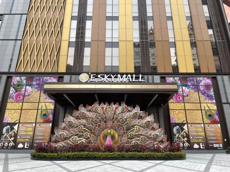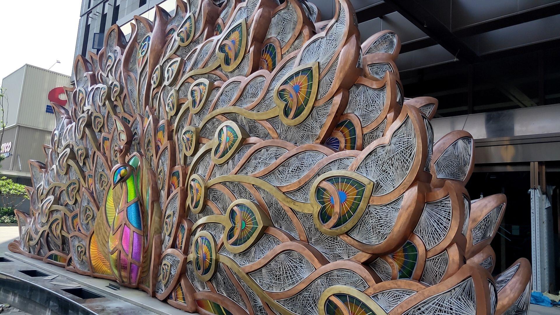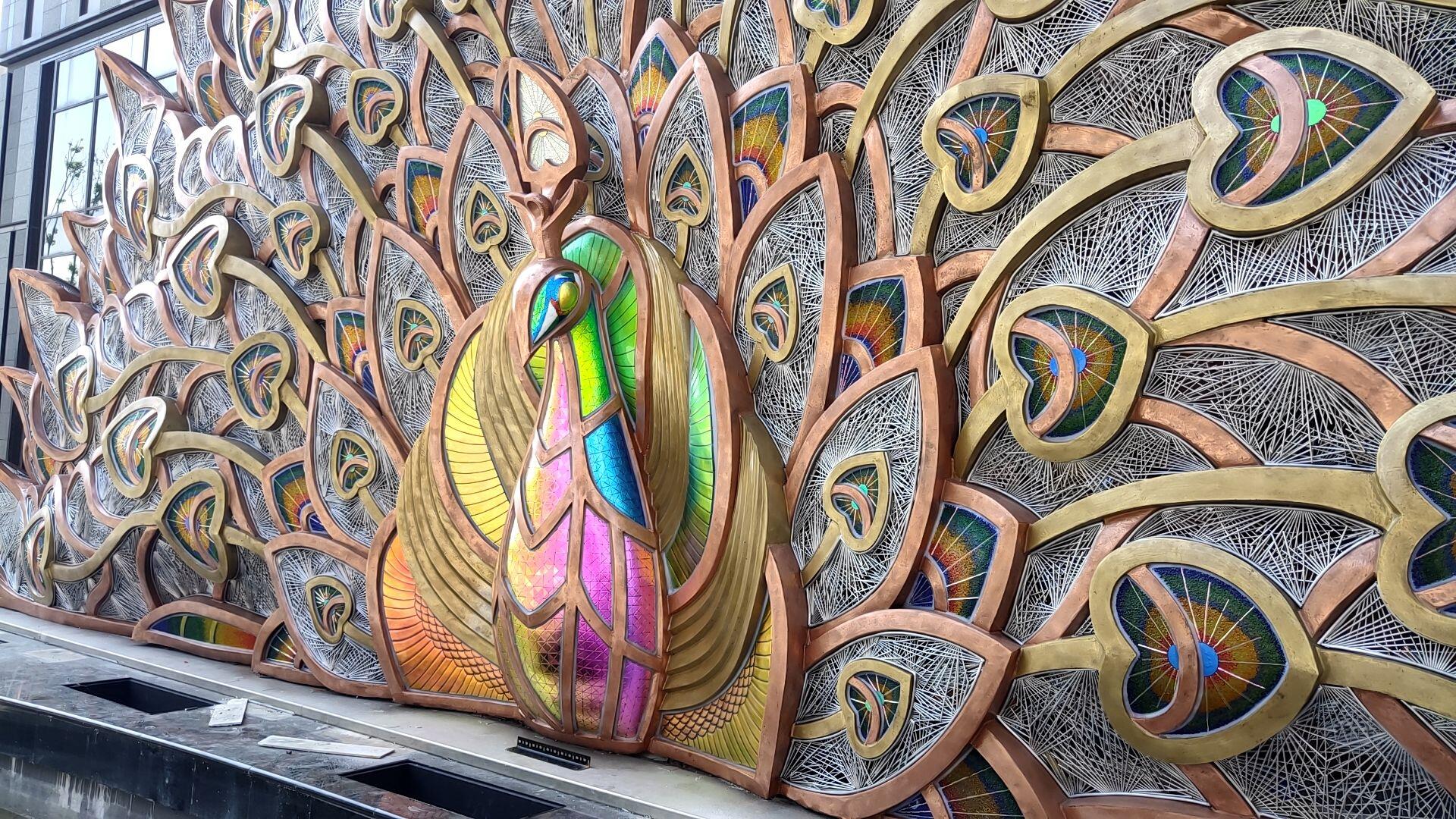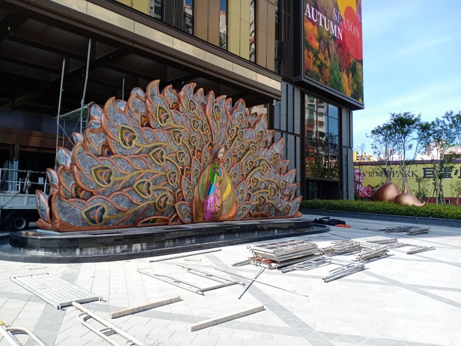 光之雀跃-孔雀开屏的装置艺术,即位在义享天地正门处,在传统文化中,孔雀是吉祥、富贵的象征,以孔雀开屏为意象融合富贵大器设计理念,迎来每一位贵宾。羽毛以黄铜、红铜不同材质依不同时间光线角度折射出幻彩效果,主身及羽毛眼以融合玻璃灯饰打造,透视出羽毛晶体般的质感,另有光雕秀设计在夜晚里呈现五彩艳丽光泽与霸气,让城市中的夜晚里增添不同色彩。